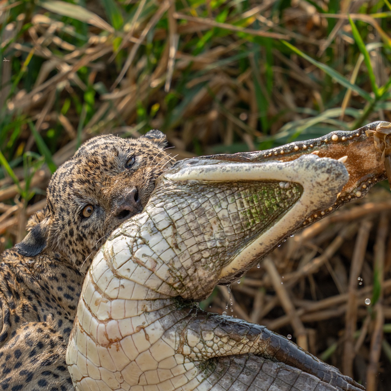 - Caiman — the most iconic predatory relationship in the region. Jaguars perform skull-crushing bites with astonishing precision.